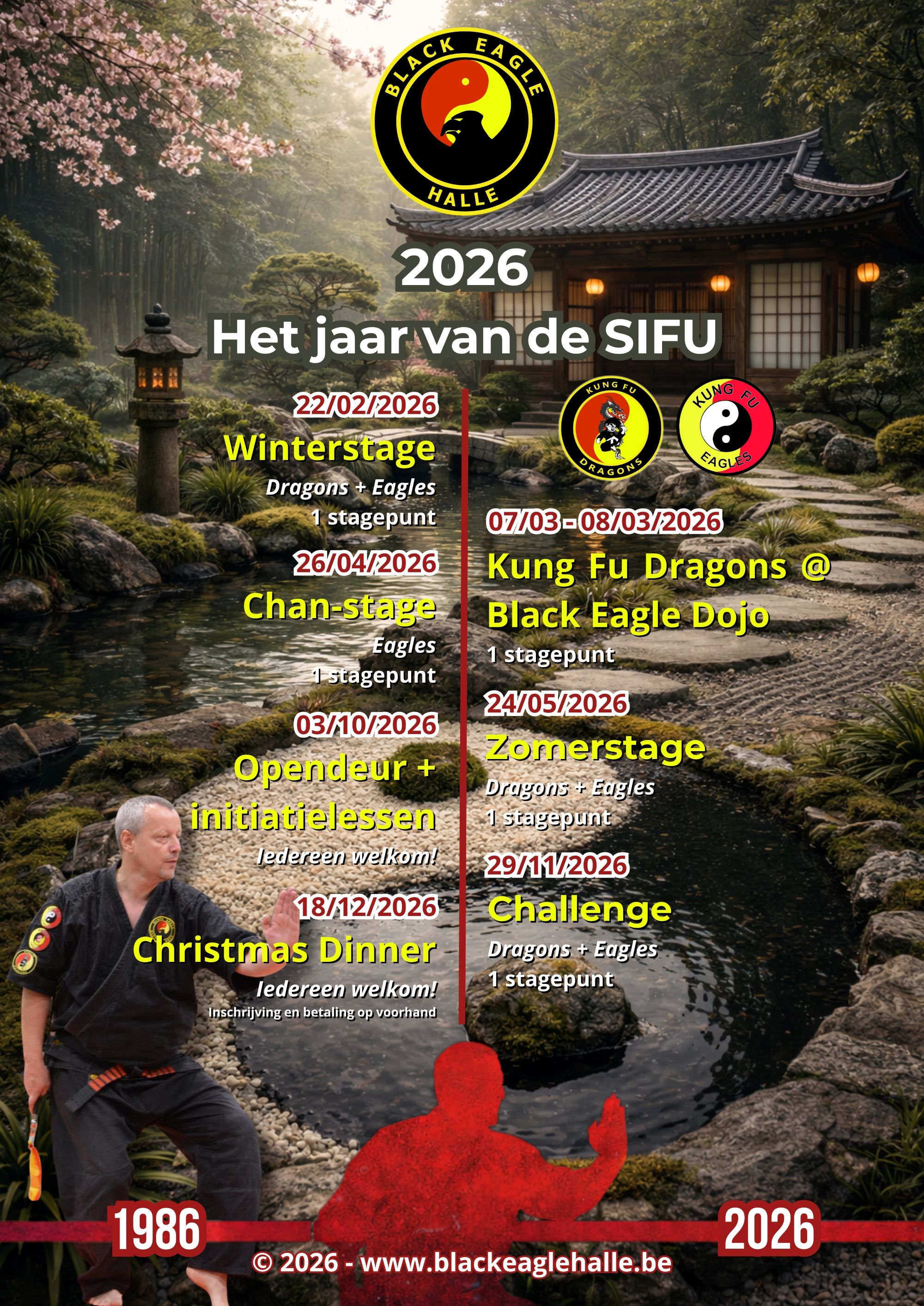 Met trots stellen wij jullie ons jaarprogramma voor. 2026 wordt "Het Jaar van de Sifu", want onze voorzitter en hoofdlesgever Jurgen Braeckmans beoefent dit jaar reeds 40 jaar krijgskunsten. Een mijlpaal voor onze club!