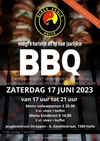 Wij nodigen jullie bij deze hartelijk uit op onze Black Eagle BBQ, welke doorgaat op zaterdag 17 juni 2023 in JC Stroppen (G. Gezellestraat - 1500 Halle) van 17 uur tot 21 uur.
